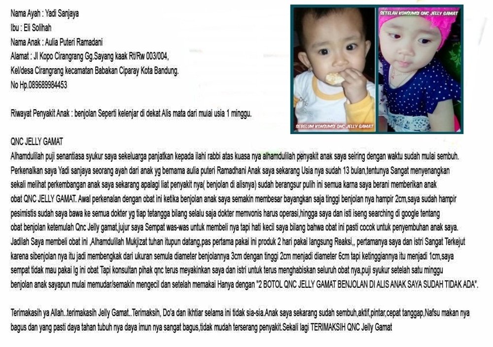 Saya seorang IRT,ber anak 1, awalnya pada bulan oktober 2017 lalu,,anak saya terlihat ada benjolan di leher nya,,saat itu saya periksa kan anak saya ke bidan biasa saya berobat,,dan ternyata bidan tsb bilang kalau itu menjurus ke penyakit TBC,dan Anak saya harus melakukan pemeriksaan di RS,,kemudian beberapa hari kemudian saya periksa di RS terdekat ,,dan di sana anak saya lgsg dilakukan beberapa pemeriksaan,dari tes mantoux,LAB ,dan Ronsen(ctscan),beberapa kali saya bolak balik RS,utk periksa hasil mantoux nya,,dan ternyata anak saya di nyatakan sakit TBC,, karna sya menggunakan asuransi kesehatan ,saya di suruh ambil obat ke puskesmas ,dan ternyata di puskesmas anak saya di cek ulang dr hasil pemeriksaan di RS waktu itu,,stelah di hitung poin,dan gejala yg anak saya derita,poin nya blm ckup untk menyatakan anak saya sakit TBC,,krn anak saya aktif,nafsu makan normal dan bb selalu naik typ bln,akhirnya dokter pun tdk mau memberikan obat,dan saya di kembalikan ke RS ,sampai di RS saya ,di rurjuk lg ke RSCM,utk tes ulang ,karna saya sdh bingung,akhirnya saya buka google ttg penyakit anak saya dan saya menemukan artikel tentang QNC JELLY GAMAT,,akhirnya saya lgsg pesan QNC JELLY GAMAT,di agen terdekat tmpat tinggal saya,